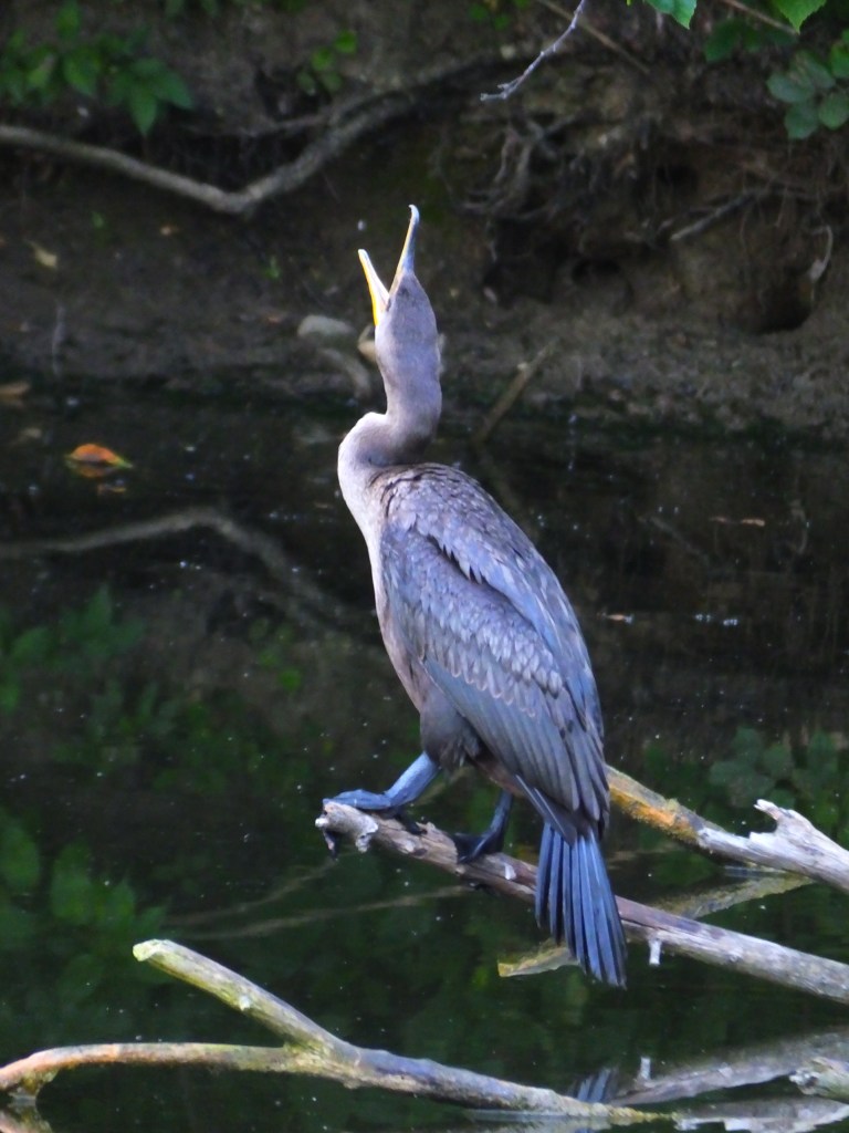 On the pond, the cormorant still reigns as the current apex predator, well except maybe for the snapping turtle, but I’ve seen no indications that the snapper is anywhere near as active. This morning the cormorant was willing to model a behavior I haven’t managed to photograph until now. This appears for all the world to be a great big yawn, perhaps instigate by my arrival with my camera yet again. It sure looks like this could be the call of the wild, but our hero has been quiet as a ghost so far.