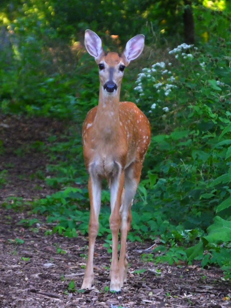 It was another morning in paradise, the cormorant was on the pond, a few birds were chirping, the crickets were singing, and this little guy, who we may have seen before, seemed beside himself with curiosity about me. For all I know, maybe he just wanted to play, and as before, he would approach me cautiously, bobbing his head around, and then scamper away. He repeated that twice before he must have had enough and simply tucked back into the woods as though this happens every day. I sure wouldn’t mind if it did.