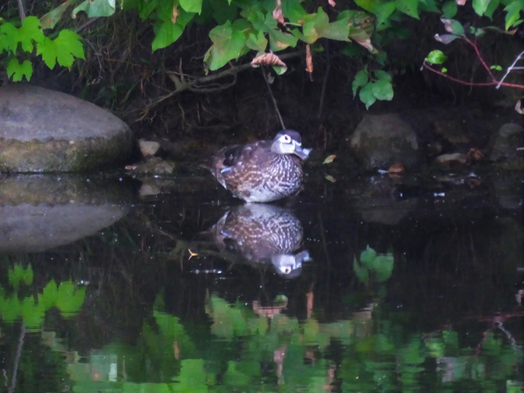 It was a quiet and slow morning in Estabrook today, and it appears that our cormorant has finally moved on from the pond, like the grebe, mergansers, teals, geese, mallards, and herons before it. The only one left there this morning was this single wood duck hen.