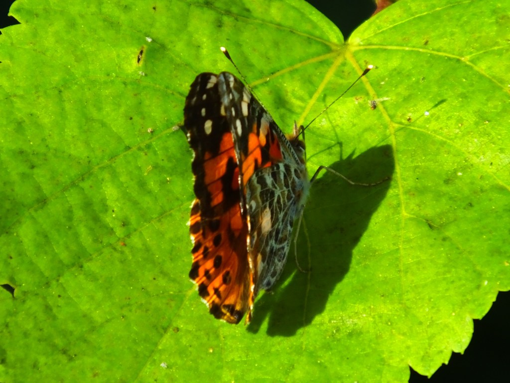And this pretty painted lady butterfly (Vanessa cardui), whom I don’t believe we’ve seen before, was sipping on drops of sap on this leaf. It looks very similar to the American Lady (Vanessa virginiensis) that we saw back in June.