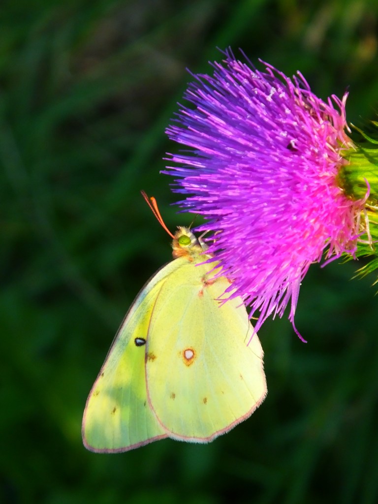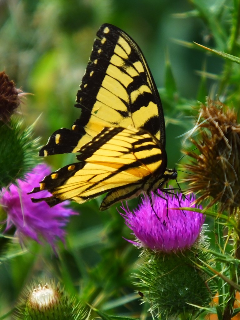 Here’s yet another pink-edged sulphur (Colias interior) contentedly, for a change, sipping nectar from a bull thistle blossom, and yet another eastern tiger swallowtail (Papilio glaucus), a male this time, doing the same.