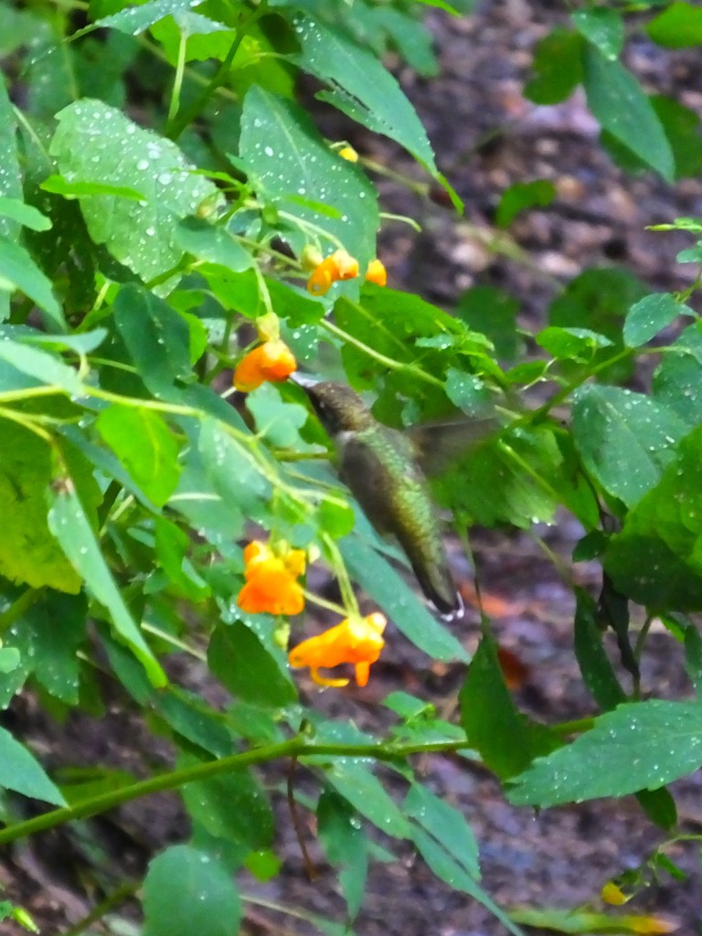 Finally, continuing with the nectar sipping theme, I have at long last captured a recognizable image, if just barely, of a hummingbird feeding on the jewelweed growing along the river trail and recently revived by the rain. Our location, the green back, white throat, and white tips on her tail feathers all suggest a female ruby-throated hummingbird (Archilochus colubris).