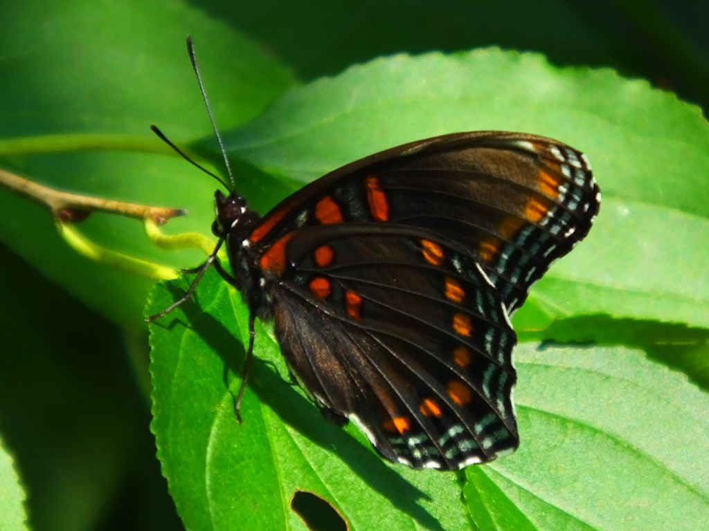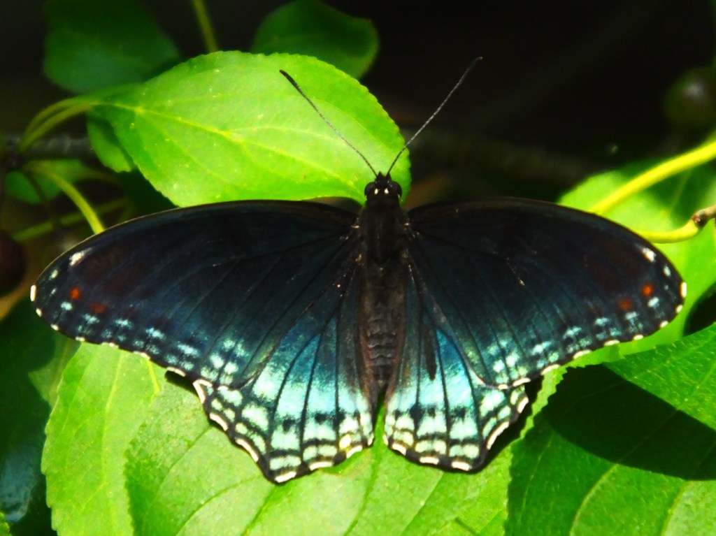 I finally found a red-spotted purple (Limenitis arthemis astyanax) that was willing to work with me and show off both its underside red spots and its topside purple patches.