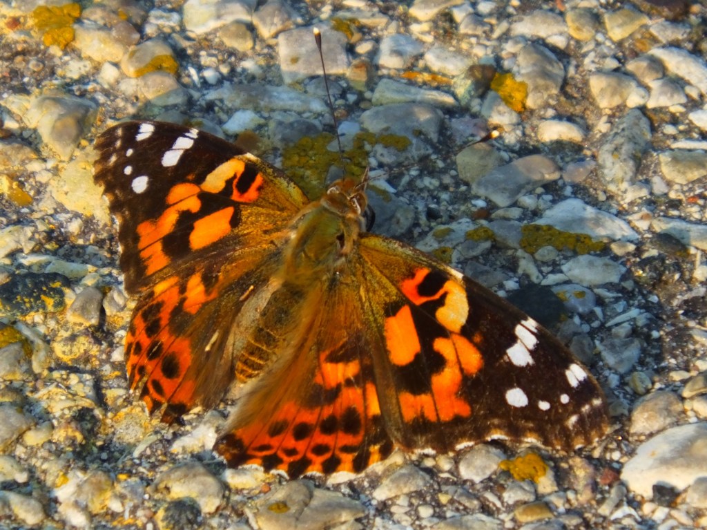 Here’s a striking red and black dragonfly that might be a cherry-faced meadowhawk (Sympetrum internum) or a ruby meadowhawk (Sympetrum rubicundulum) on the mudflats, and another painted lady butterfly (Vanessa cardui), which seem to be everywhere all of a sudden, warming up in the morning sun on the parking lot pavement.