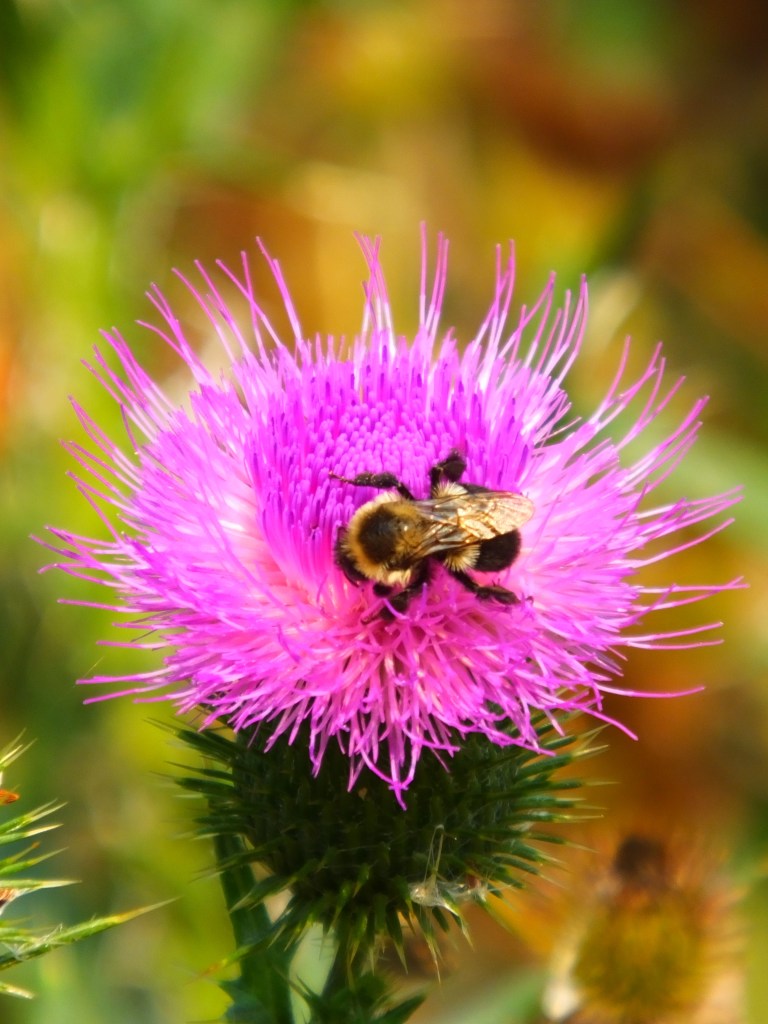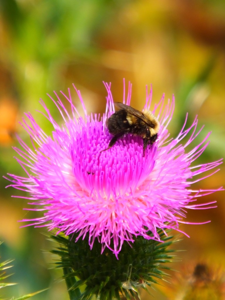 Speaking of sipping nectar, did anyone see the blurb in yesterday’s NYT Science Times on the recent discovery about how honey bees drink nectar? It turns out that they can either sip it or lap it, depending on how viscous it is. “Once again, insects prove to be more complicated than scientists thought they were.” Well, these aren’t technically “honey bees”, but perhaps they are just as versatile. Man, that bull thistle sure is popular these days.