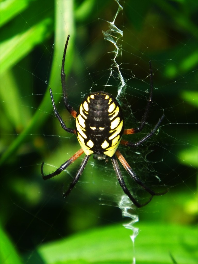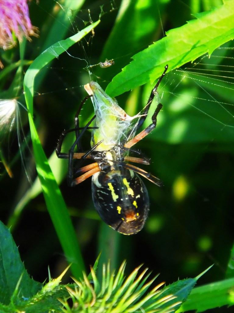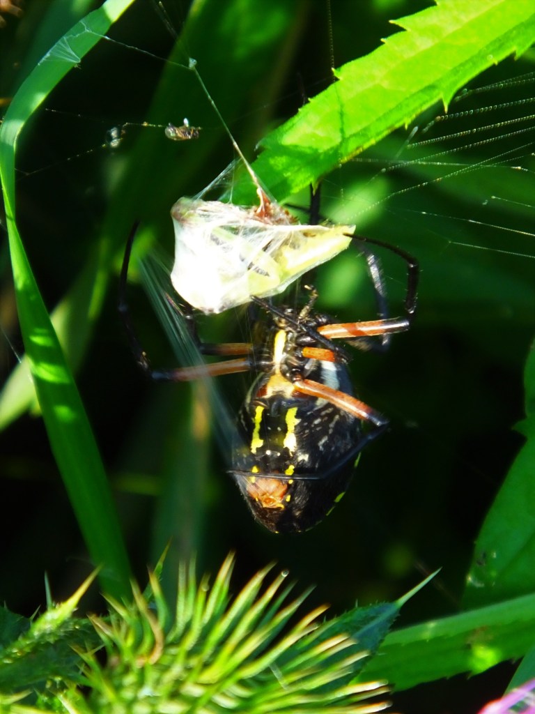 Another astounding sight I got to witness this morning is our striking female black and yellow garden spider (Argiope aurantia), whom we just saw on Monday in the bull thistle, quickly handling a fresh catch in her web, some sort of small cricket or katydid. And, once she had it all wrapped up, in just a minute or so, she immediately went back to her post on the stabilimentum she created down the center of her web. If you look closely at the middle image, you can even see the wide band of silk strands she is secreting to wrap her prey way more efficiently than she should could with just one strand at a time.