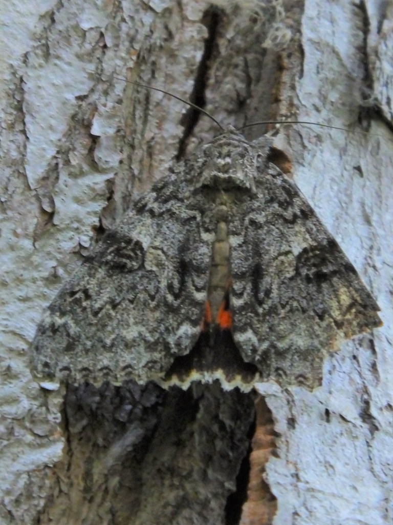 There are dozens and dozens of species of these underwing moths that all look amazingly similar. For a brief peek at the rabbit hole I’ve been down this morning trying to ID this particular one, click here, here, or here. I’ve sequentially thought it was a bride underwing, a youthful underwing, and a once-married underwing, but finally settled on hermia underwing based on this photo by Jim Moore. Note the distinct circular shape with a dark outline halfway along the leading edge of each wing. I think it is a good match.