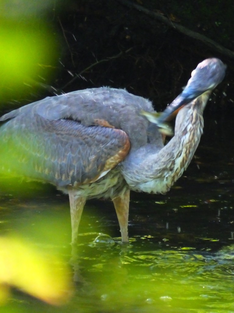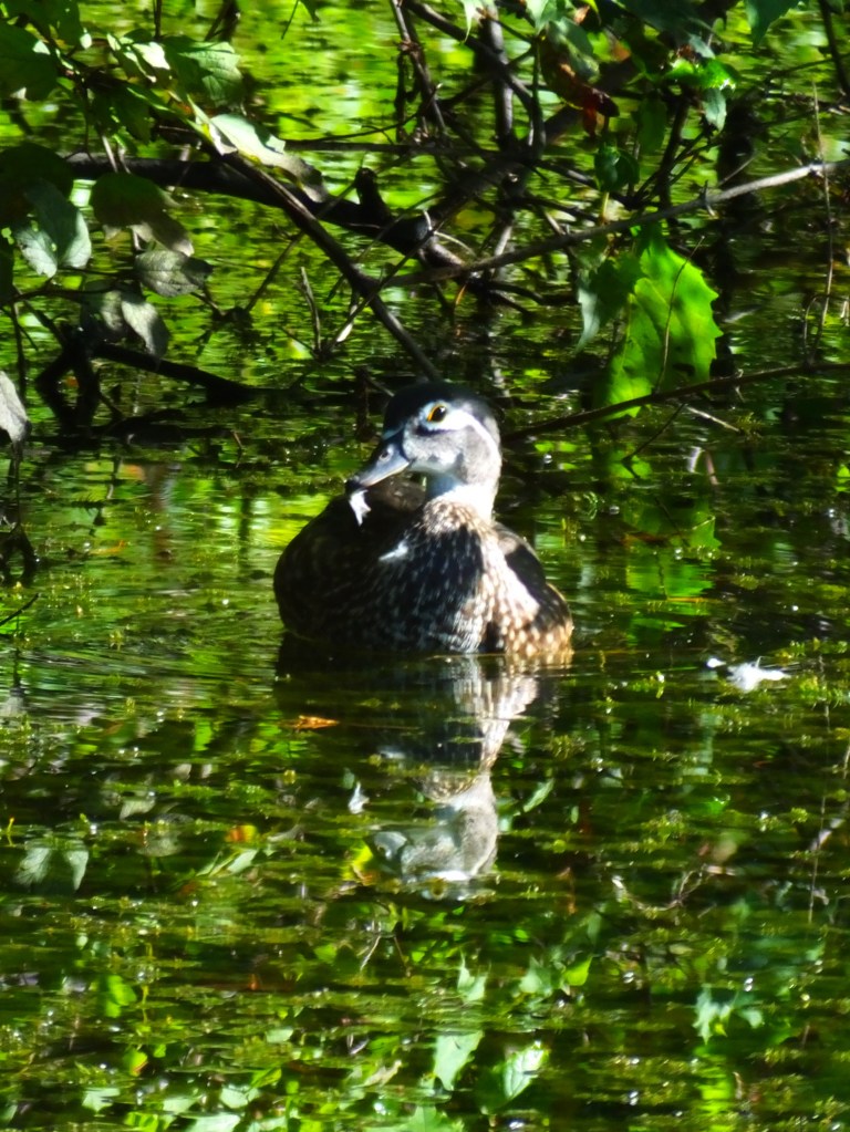 A wood duck hen and a blue heron were on the pond. The heron even caught a fish, which it handily swallowed in one clean gulp.
