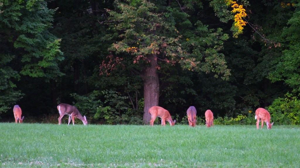 I probably sat and watched them for about 20 minutes before I headed north, leaving them still out on the field. And so there I was, strolling along the parkway, thinking about how I would write up seeing six deer at once, when I approached the middle parking lot, and I couldn’t believe my eyes. There were two more, probably another doe with her fawn, enjoying the glorious morning. Ach du lieber!