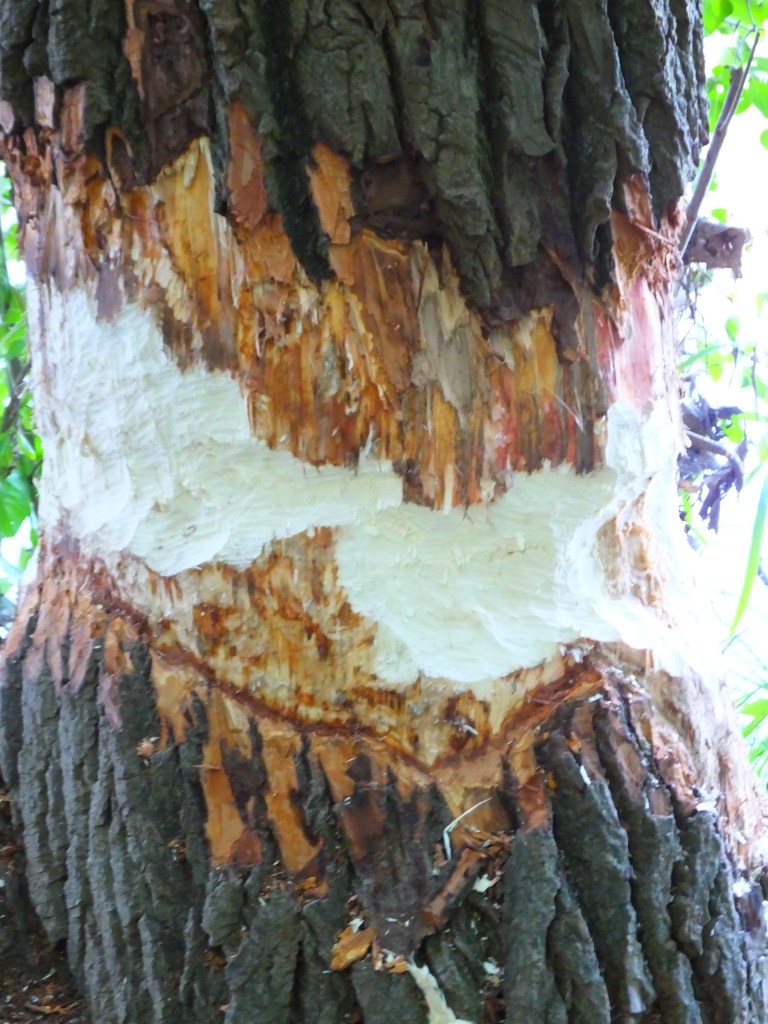 Along the river, the beaver continue to work on that cottonwood tree. Note the freshly exposed wood, lightest in color, now extends all the way around the east side, compared to just yesterday. The pile of huge chips is growing.