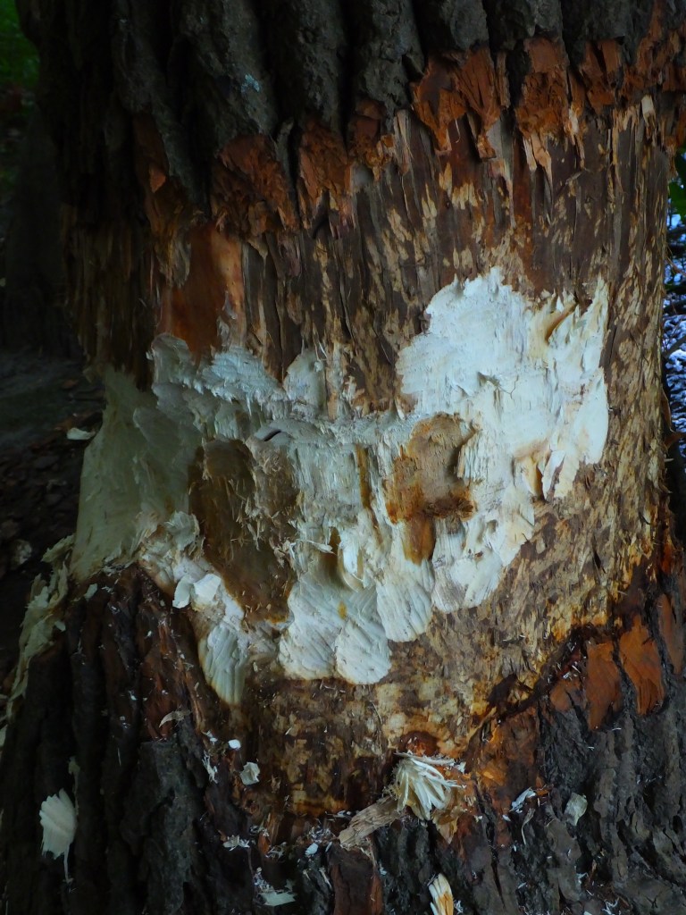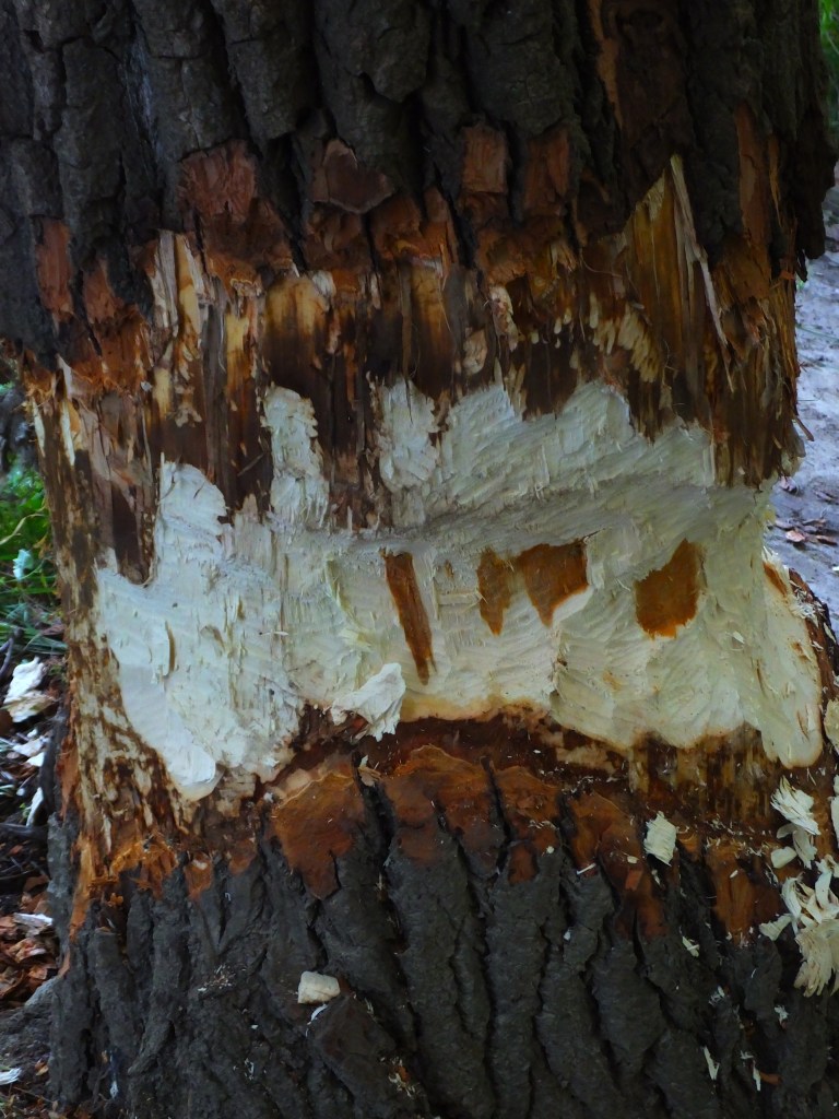 The beaver continue to work on felling that huge cottonwood tree further north along the river trail. You can see that they are really starting to make a dent on the east side and are through the layer of very light-colored wood and back into some darker stuff in a couple of spots. The pile of chips around the base of the tree is getting bigger every day.