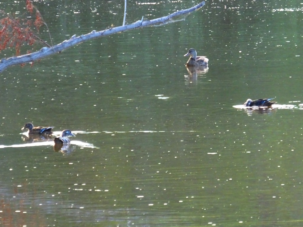 Ducks were on the river, and the group comprising one mallard and some wood ducks that we saw in the pond recently seem to be still sticking together. If it’s not the same group, then perhaps it’s a common inter-species arrangement.
