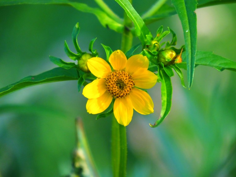 And new blossoms continue to appear. Here’s a pretty little yellow flower just coming into bloom on the mudflats, and it turns out to be another beggarticks, this time nodding beggarticks or nodding bur-marigold (Bidens cernua)