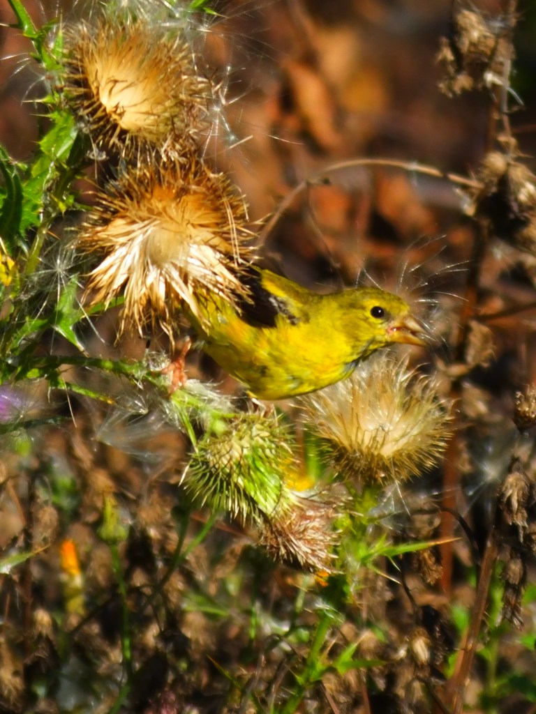 The goldfinches, this time a female, are still working on those bull thistle seeds.