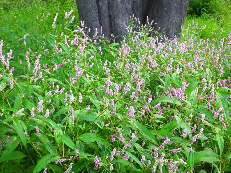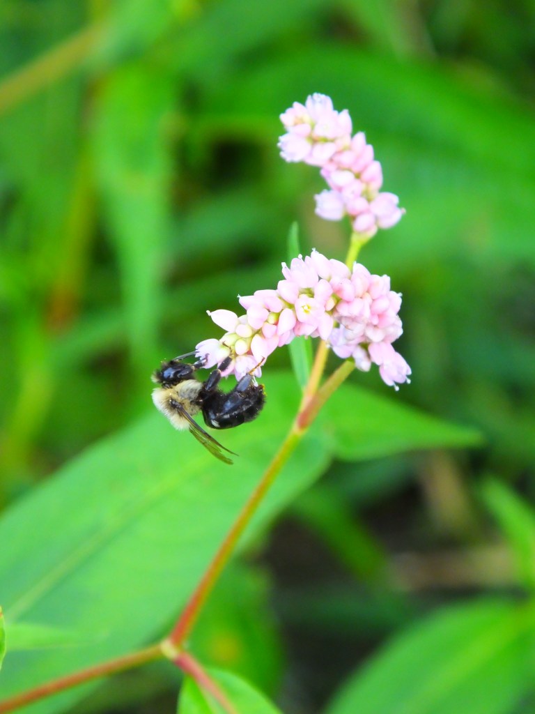 Back on the mudflats, yet another knotweed, this one goes by the names lady’s thumb, spotted lady’s thumb, Jesusplant, and redshank (Persicaria maculosa), is in full bloom and feeding the bumblebees.