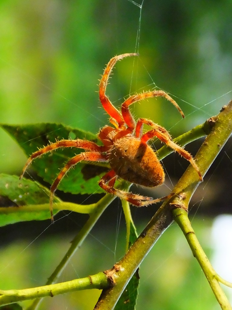 Finally, this good-sized spider, perhaps a spotted orb-weaver (Neoscona crucifera), has woven quite an impressive web, easily 2 feet in diameters, strung between a tree branch and the tall grasses below. It’s in the same family, Araneidae, as our black and yellow garden spider (Argiope aurantia), and we’ll have to wait for a nice heavy dew for a decent picture of the web.