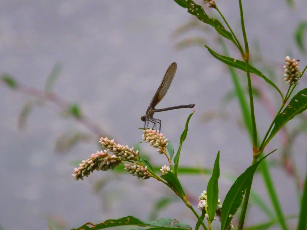Also on the mudflats were a few damselflies, and this one on a knotweed blossom might be the same American rubyspot (Hetaerina americana) we saw back at the start of September.