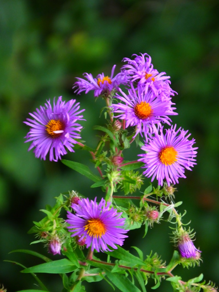 Before I go, here are some pretty asters, probably New England asters (Symphyotrichum novae-angliae), finally coming into bloom, but I’m sad to say that I couldn’t find an equally pretty butterfly, moth, or bee to pose on them for us.