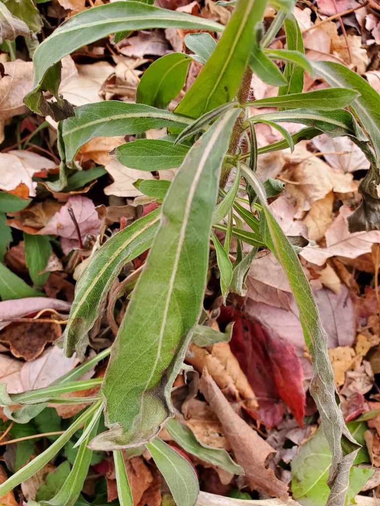 Ha! I was just as stunned to find this as you probably are to read about it. My best guess is that this is a hairy goldenaster (Heterotheca villosa) in bloom on DECEMBER 5TH at the top of the slope from the falls up to the beer garden. Surprise, surprise, eh?