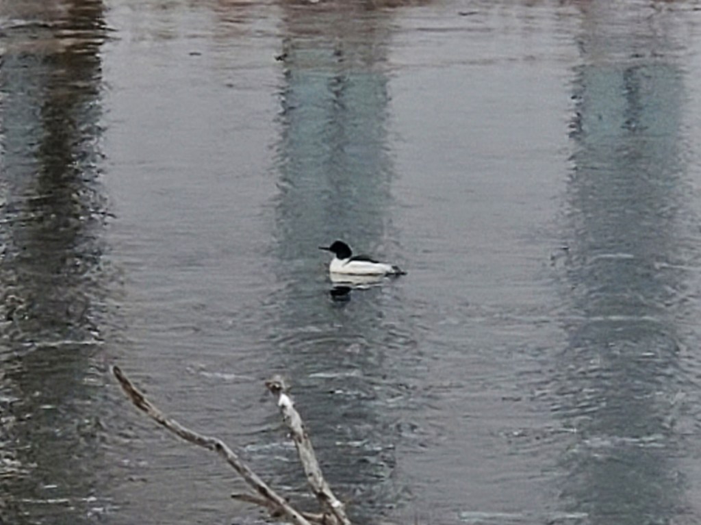Happily, it appears I was mistaken, and as far as I can tell, that is a male common merganser. It clearly is not a similarly colored goldeneye or bufflehead because of its distinctly long and narrow beak, which leads common mergansers to sometimes be “called sawbills“. In fact, I read further that “the word “merganser” comes from the Latin and roughly translates to “plunging goose”—a good name for this very large and often submerged duck.”