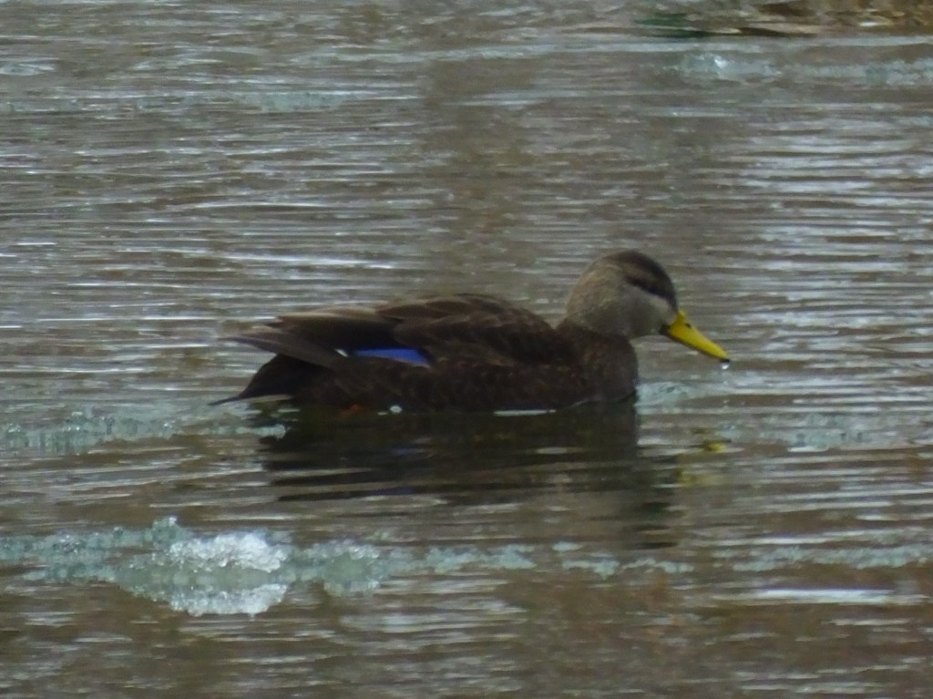 Sure enough, it is an American black duck (Anas rubripes), which, as the good folks at the Cornell Lab of Ornithology explain, “hides in plain sight in shallow wetlands of eastern North America. They often flock with the ubiquitous Mallard, where they look quite similar to female Mallards. But take a second look through a group of brown ducks to notice the dark chocolate-brown flanks, pale grayish face, and olive-yellow bill of an American Black Duck.” Here’s another shot which is not quite as clear but shows off the pretty blue patch on its wing.