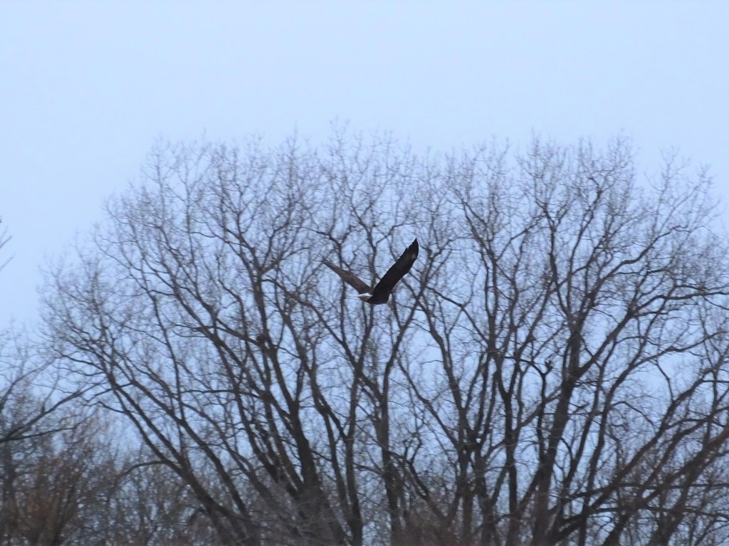 Anyway, as I was standing there on the shore, wondering if I was seeing something new or wasting my time and film while freezing my fingers and buns, just about all the mallards suddenly took flight, and it was such a stunning sight that I didn’t even think to take a picture. As I watched the spectacle unfold with my mouth agape, I saw the cause of all the commotion, an American bald eagle (Haliaeetus leucocephalus) gliding overhead, once again about even with the treetops. I guess a few dozen mallards in the air was not what it had in mind because it simply turned around and headed back north, and this is all I’ve got to show for it. If you squint, you can just make out the white tail and maybe even the white head.