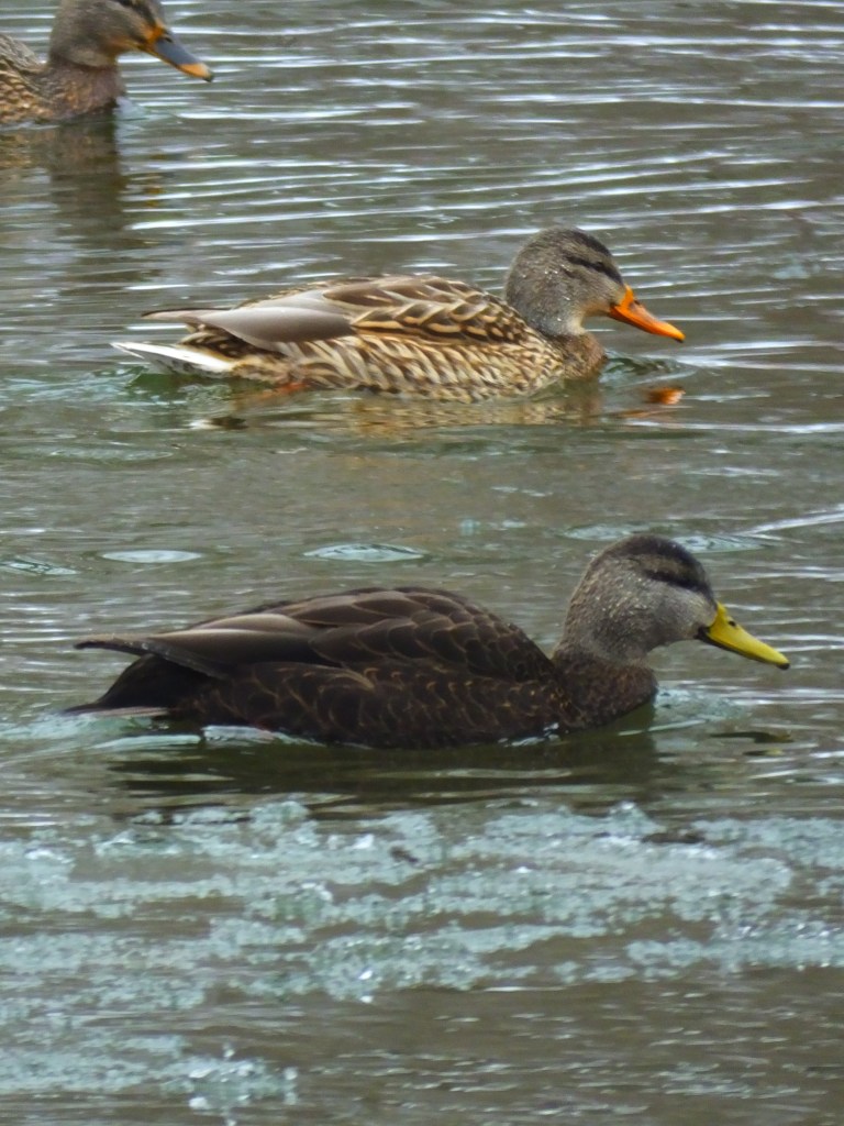 It was pretty cold this morning, with “real feel” temps in the mid teens, so the trail was in good shape, and I just about had it all to myself. The critters were keeping a low profile, and I didn’t see much more than a chickadee until I got to where the mallards hangout north of the falls. There, as I scanned the crowd for interlopers, I spotted one that looked darker than the rest.