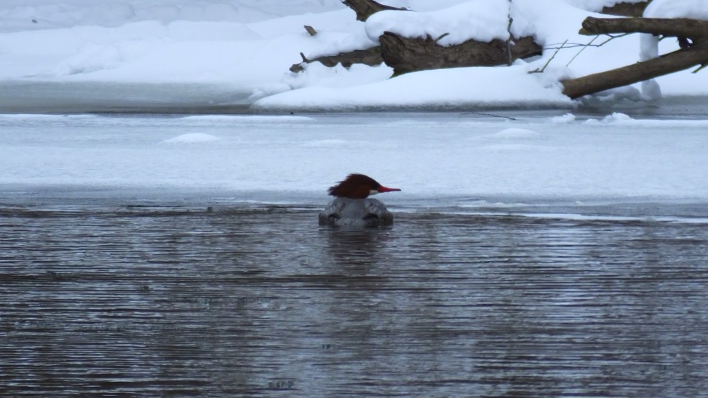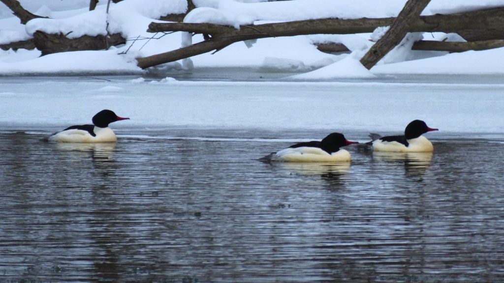 Well, back in the here and now, the common mergansers were also back on the river, and this time there were four of them; three males and a female. “And furthermore Suzan, I wouldn’t be the least bit surprised to learn that all four of them habitually smoked marijuana cigarettes…” Just kidding. They don’t even have fingers, so that’s not very likely.