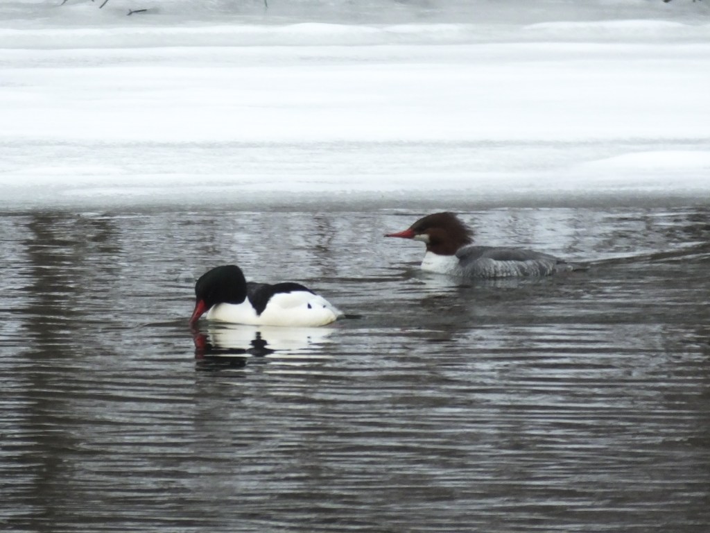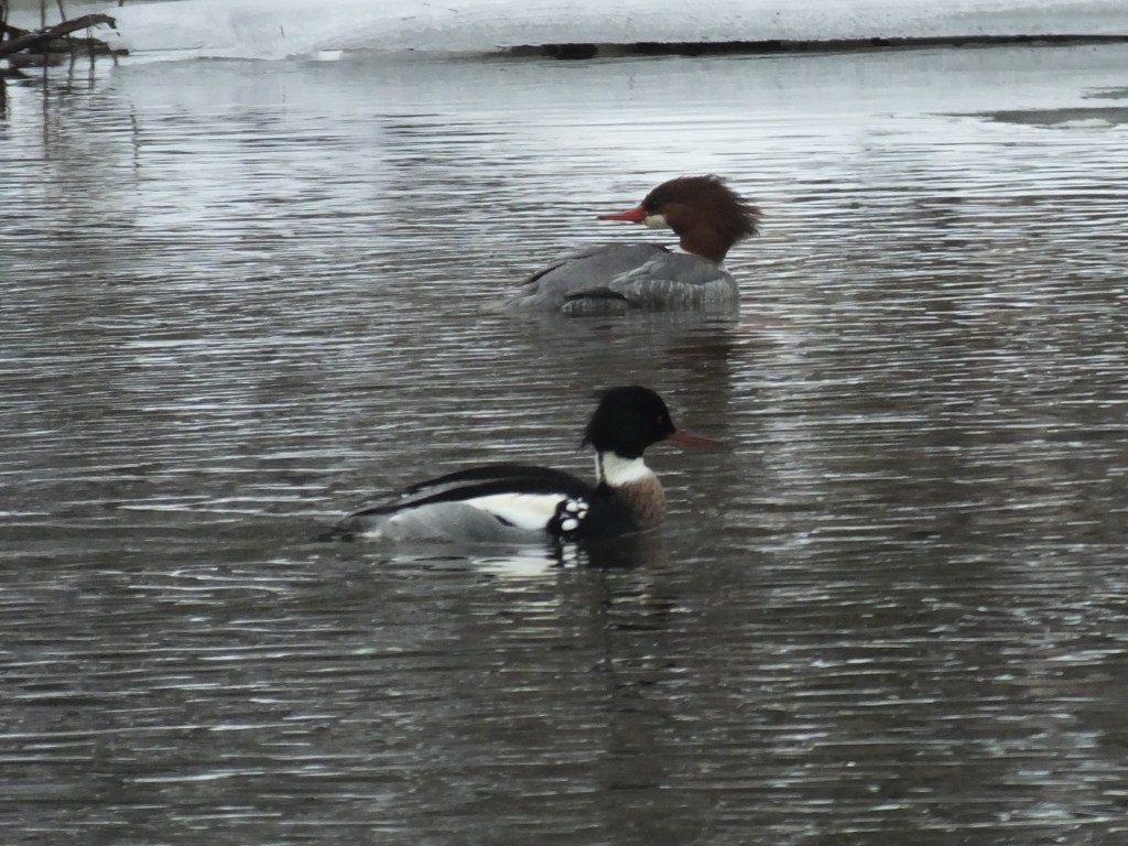 Here’s a better view of the male red-breasted in the foreground with the female common in the background:
