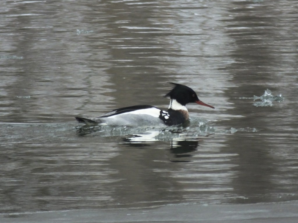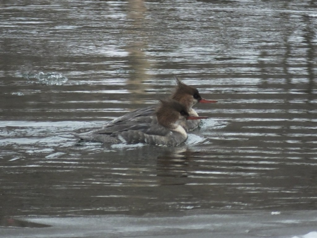 The mergansers were back on the river this morning, and this time I counted 5 altogether: 1 male and 1 female common, and 1 male and 2 female red-breasted. Here they all are together: