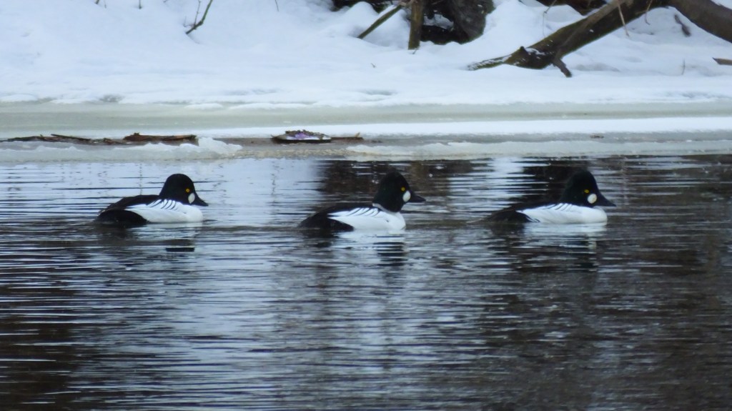Anne didn’t get the jigsaw puzzle finished last night, so I didn’t get to the park till after lunch today. The pair of buffleheads were there again, but even more shy than yesterday, so I didn’t even both with a new picture. There were three goldeneyes today, which makes for a fun scene.