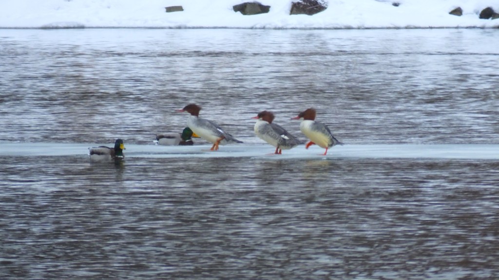 There were at least three female common mergansers, and they even hopped up onto the ice. I’ve never seen a merganser walk before, so that was fun for me.