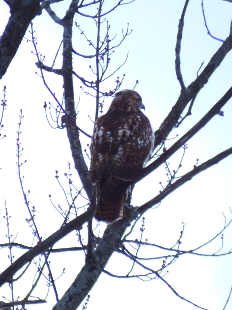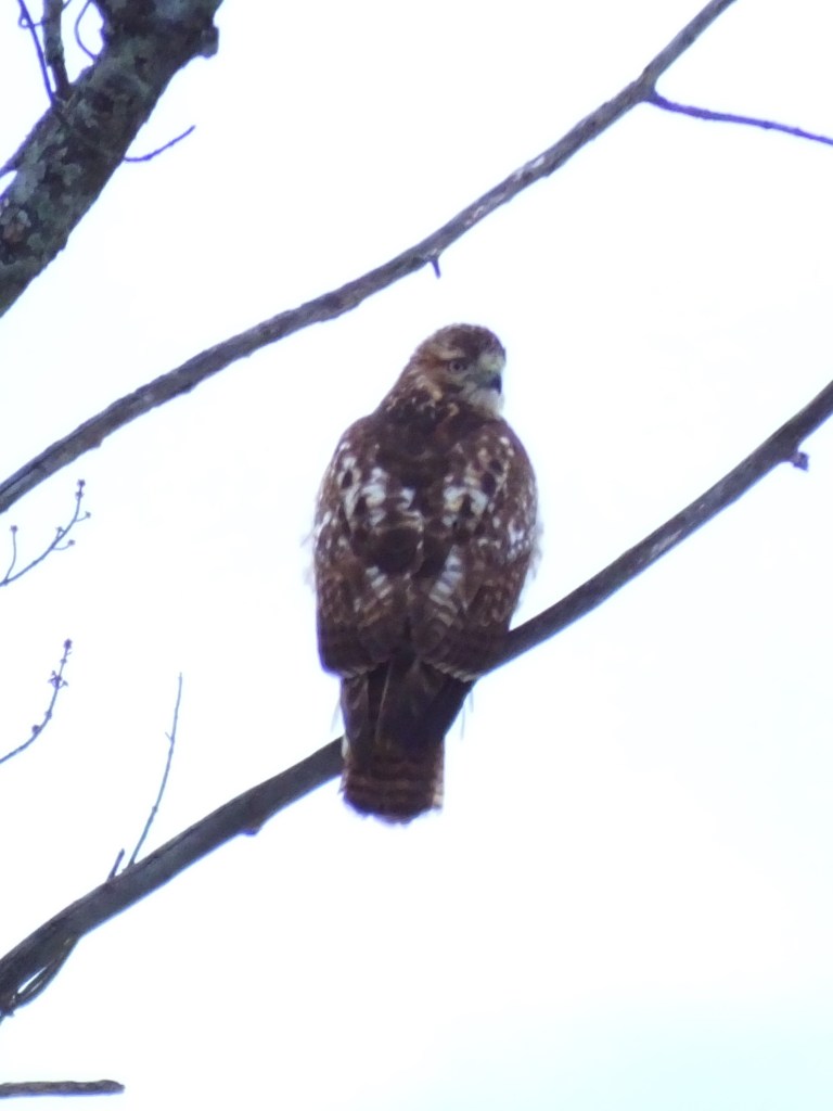 Finally, a raptor soared by and stopped in a tree over the far side of the river. At first I thought it was the merlin we’ve seen before, but once I got the pictures home, I could see that’s not right. Neither that Cooper’s hawk nor the sharp-shinned hawk has such a finely bared tail, and it is surely the the solid red of the red-tailed hawk we just saw. Here are my two best pictures. Can anyone identify this raptor? Maybe some red-tailed hawk variant, such as the “juvenile dark morph“