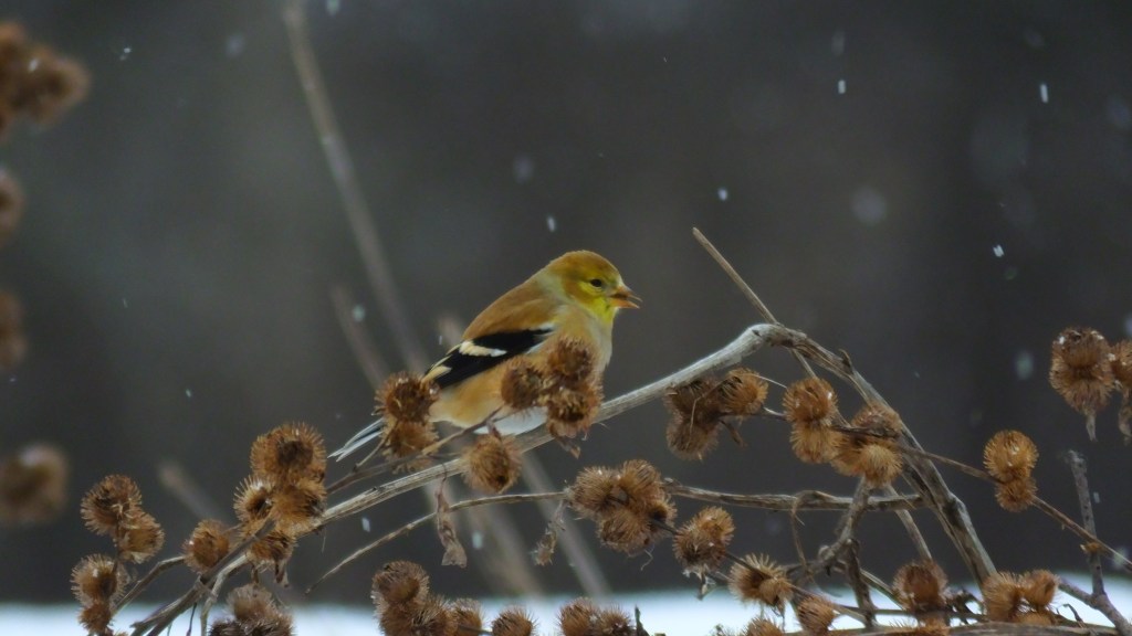 It was a nice January morning, with freezing temps and a dusting of snow, but hungry birds gotta eat, so here’s a goldfinch filling up on great burdock seeds beside the southern soccer fields.