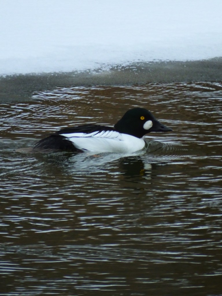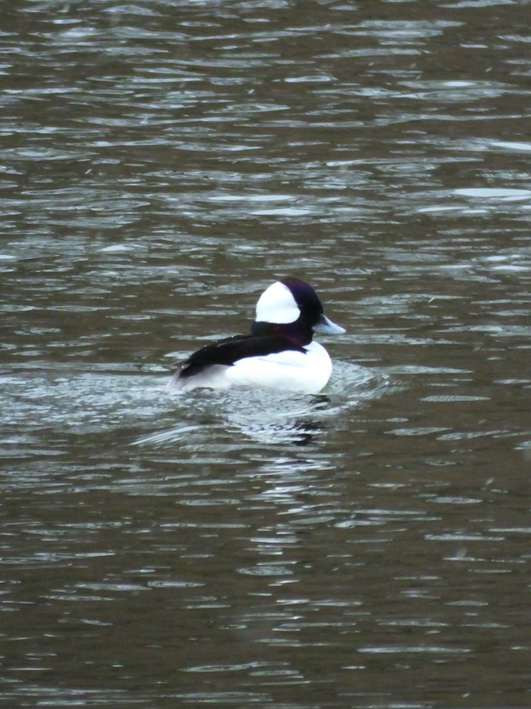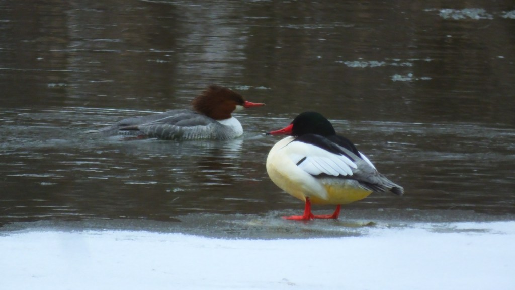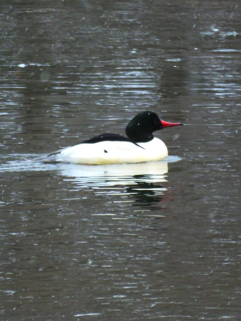 Down on the river, just about all the usual suspects were about, including all three of the white water fowl we’ve been seeing: common merganser, goldeneye, and bufflehead.