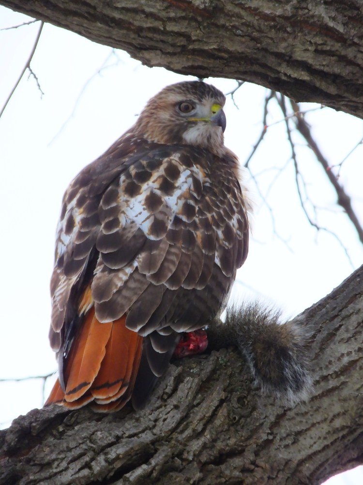 Lastly, as for our mystery raptor, I’m going to go with juvenile red-tailed hawk, after further research. All the other raptors (red-shouldered hawks, goshawks, falcons, harriers) seem to have noticeably longer tails, and I can find plenty of pictures online of birds that look like ours that are described by the poster as “juvenile red-tailed hawk”. Some examples are here: