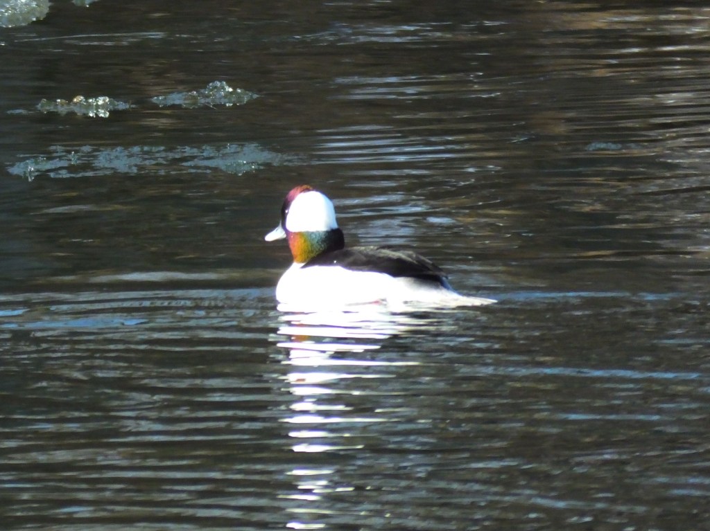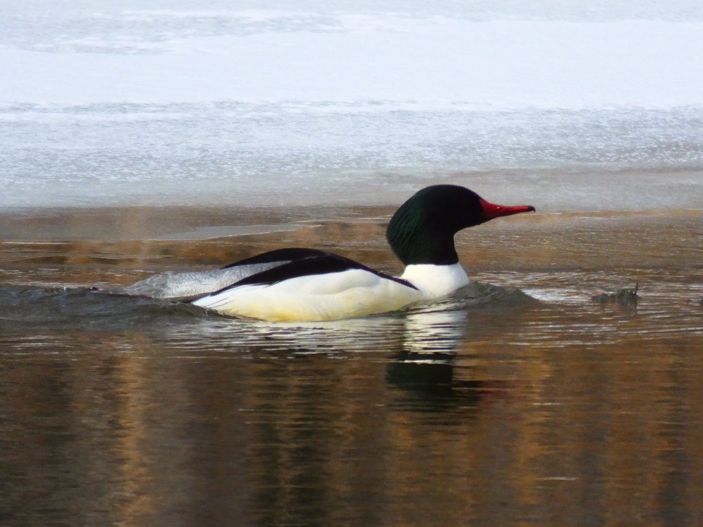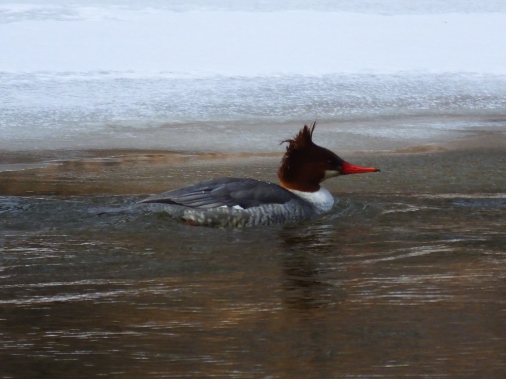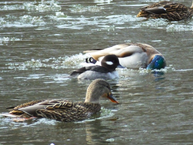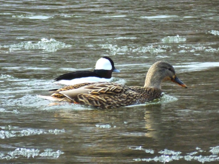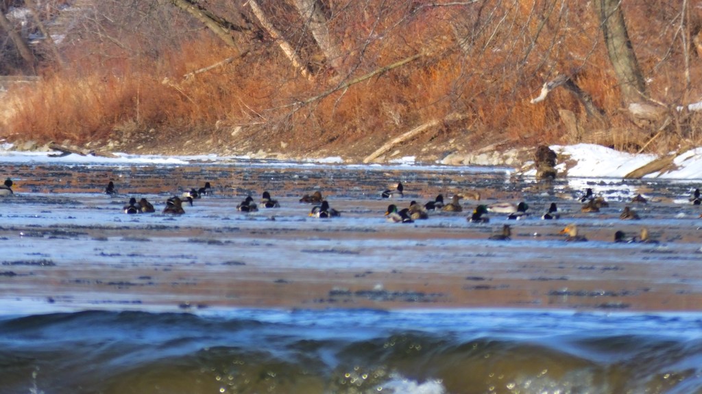 There was a lot of activity on the water, and just about everyone was there today: geese, gulls, mallards, mergansers, goldeneyes, and the tiny pair of buffleheads. The only one missing was that black duck we saw a couple of weeks ago. Sorry Lou. Anyway, here’s my attempt to capture the moment. Trust me, it was even better in person!