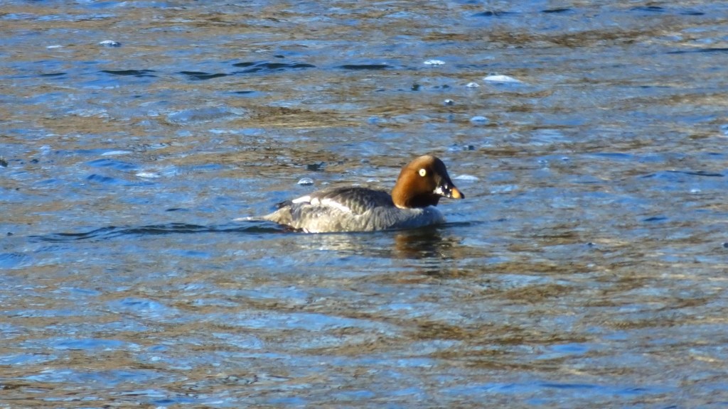 Usually, the lower half of the river, south of the mudflats, is pretty empty, with just a few mallards and maybe a gull or two, but today I saw somebody new, our first female goldeneye, swimming and diving all by herself. I wonder if she has already checked out the dudes up river and simply found them all lacking.
