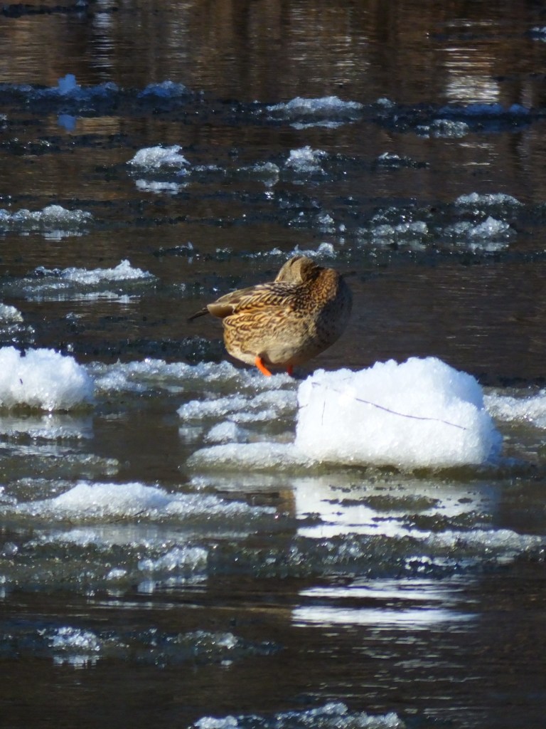 When I did get to the falls, I was surprised to find just a dozen or so mallards, no diving birds, and no raptors. I wonder what’s up with that? Anyway, the remaining mallards seemed to be doing just fine, and these two characters, even took a break to ride on an ice floe.