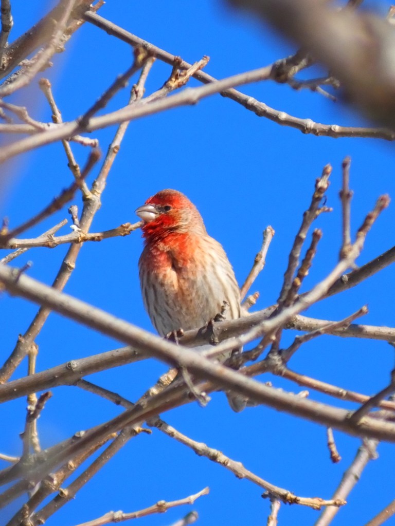 Finally, I swung by the pond to check on our Cooper’s hawk from yesterday, after one concerned reader wonder if it was somehow stuck to that branch. I’m sure you’ll all be relieved to know that, as of this morning, it appears to have successfully moved on. Phew! Instead, I was serenaded by this red-hued little fellow, and this time I’m going with house finch (Haemorhous mexicanus). Don’t @ me!