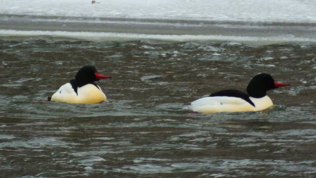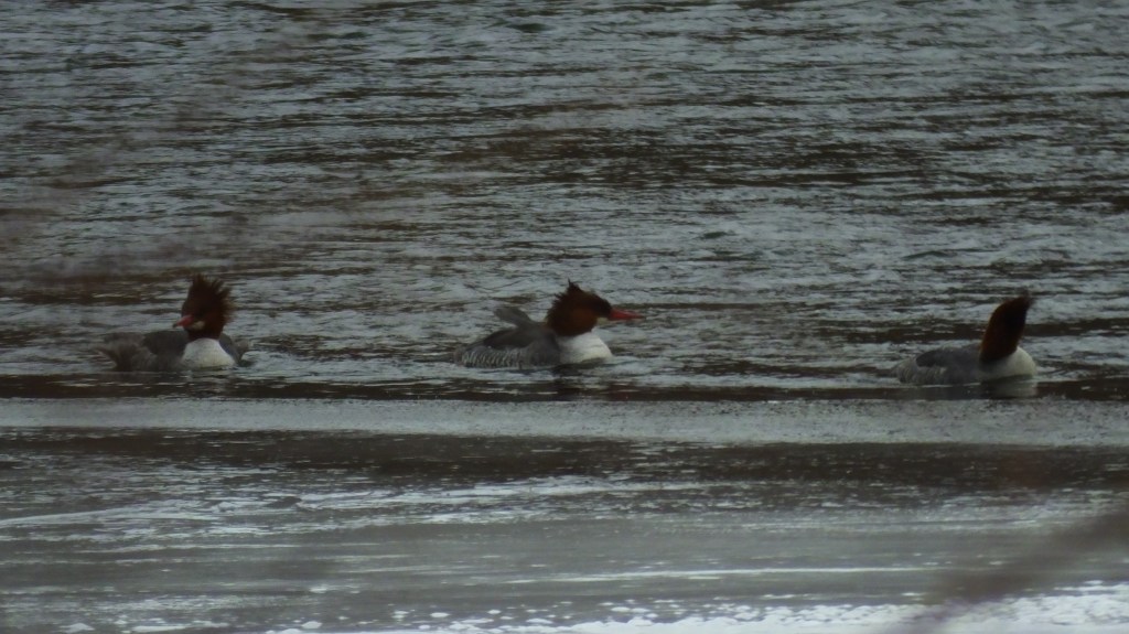 Luckily, all the critters appear to have done just fine without me. At the south end, there were a couple of male common mergansers and at least eight females, which is more than I’ve ever seen before in one day, let alone in one place. The most I could get in a row, however, were these three: