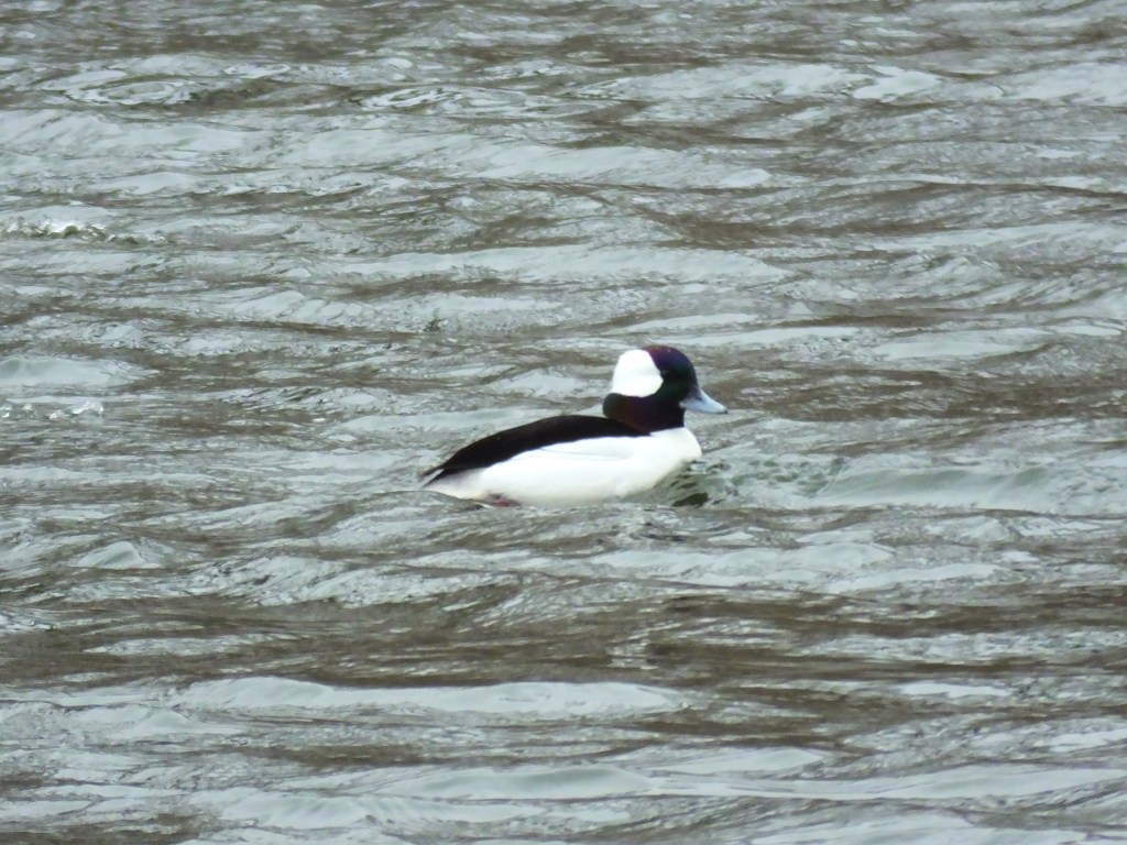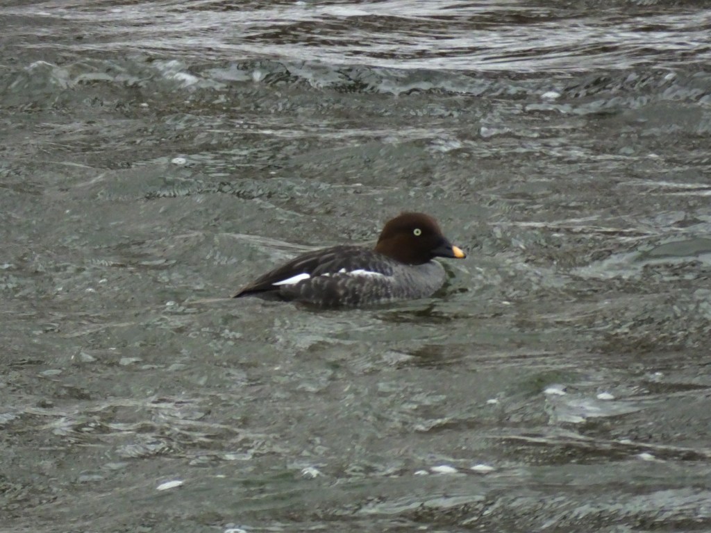 As I was trying to line up that shot, a bald eagle drifted overhead, but kept right on going. Just up river from the mergansers was our female goldeneye, a bit down river from her usual spot, and still unaccompanied. Come on, guys!