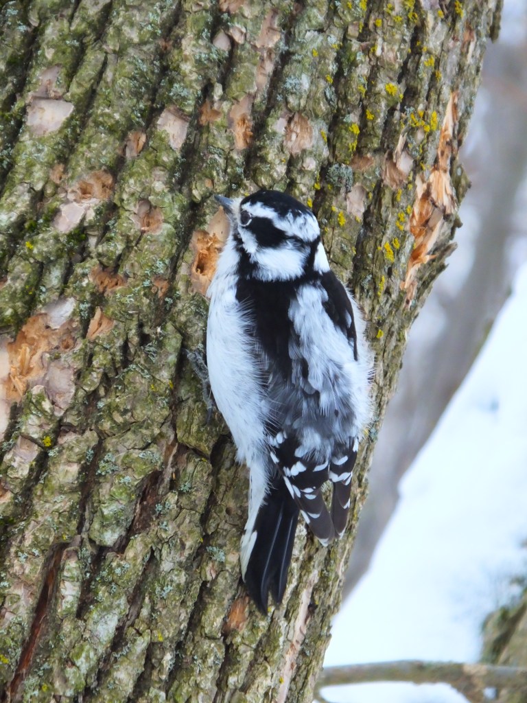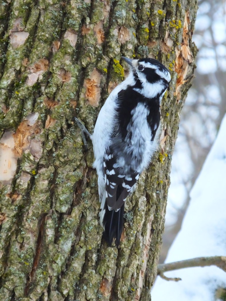 From the comfort of my dining room table, I’m gonna say that she’s a downy woodpecker because of the dark spots on her white tail feathers and her smaller beak relative to a hairy woodpecker. In the “after” picture on the right above, you can see how much bigger and deeper she had made the hole in the bark during the two minutes she allowed me to stand there taking pictures. That was a rare treat, and I sure hope she got what she was digging for.