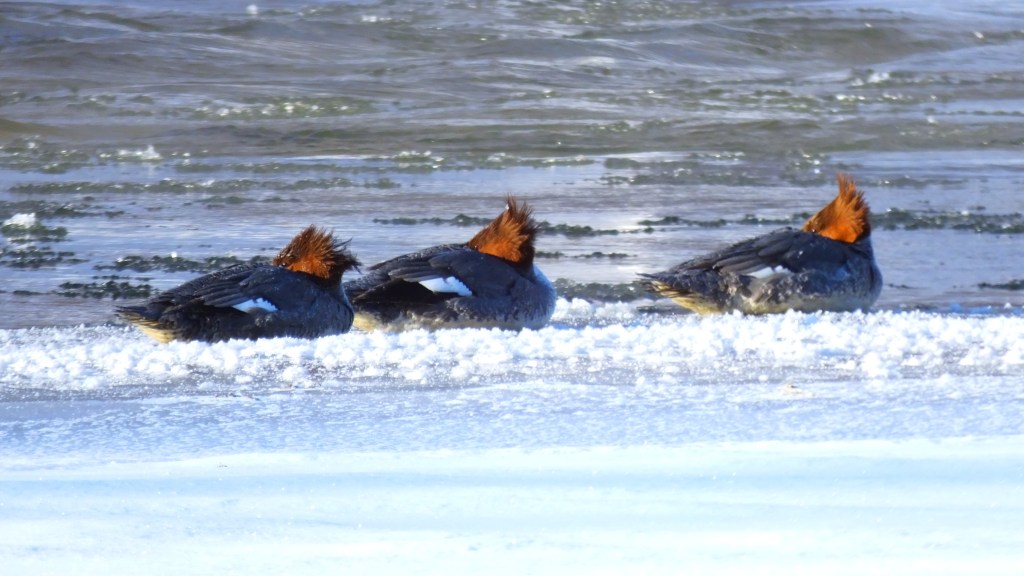 On the lower river, a trio of female common mergansers were all keeping watchful eyes on me as they waited out the cold on the river ice, but they opting not to budge as I took their picture. There were a couple more, out of frame, but I thought these three made the nicest composition.