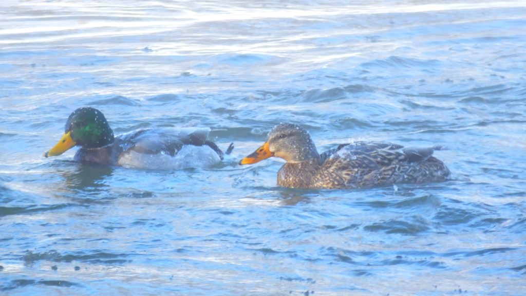 Just north of them, this pair of mallards floated by in the thick steam fog rising off the relatively-balmy 32°F water. You can see little beads of ice formed all over their heads. Brrr.