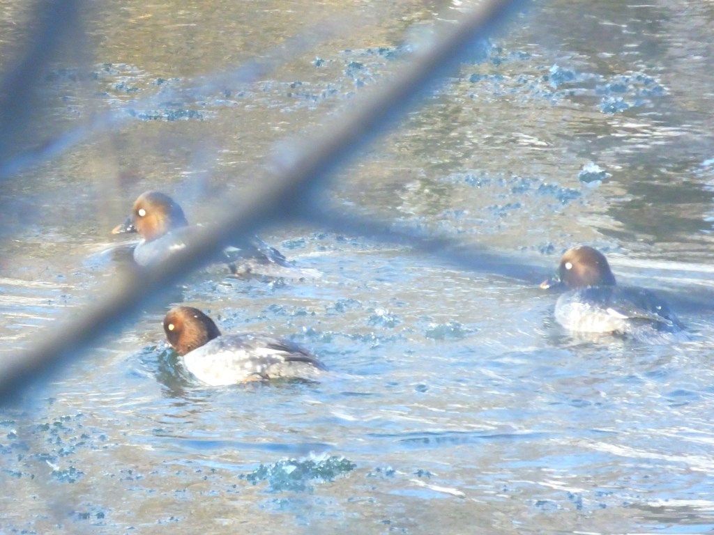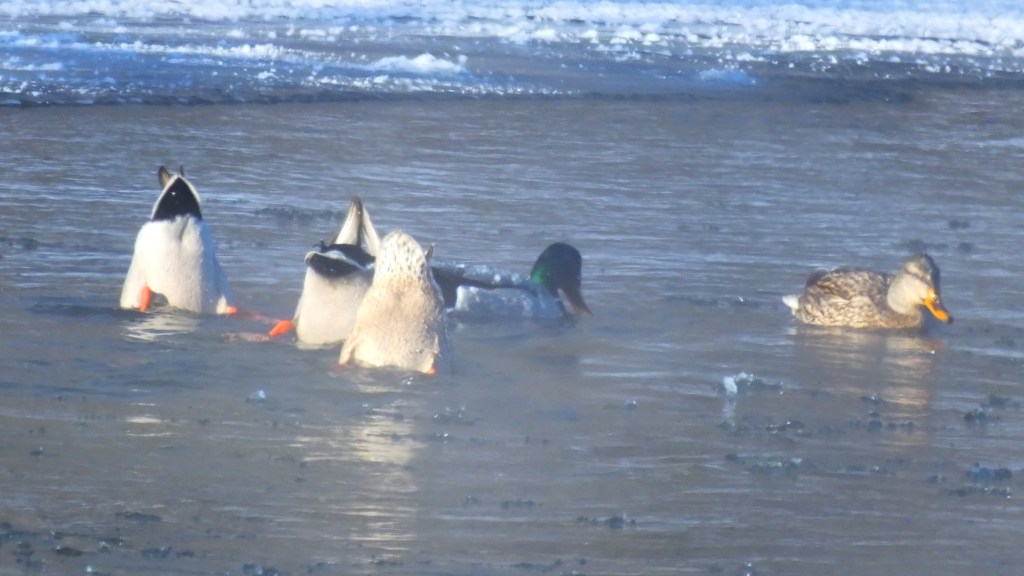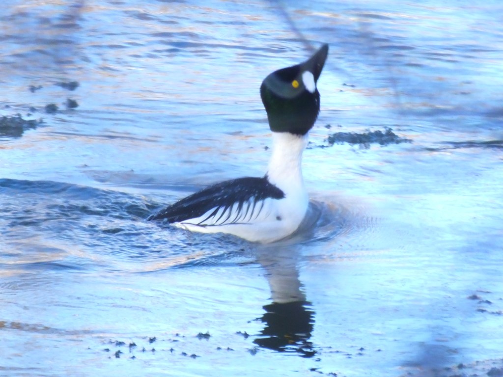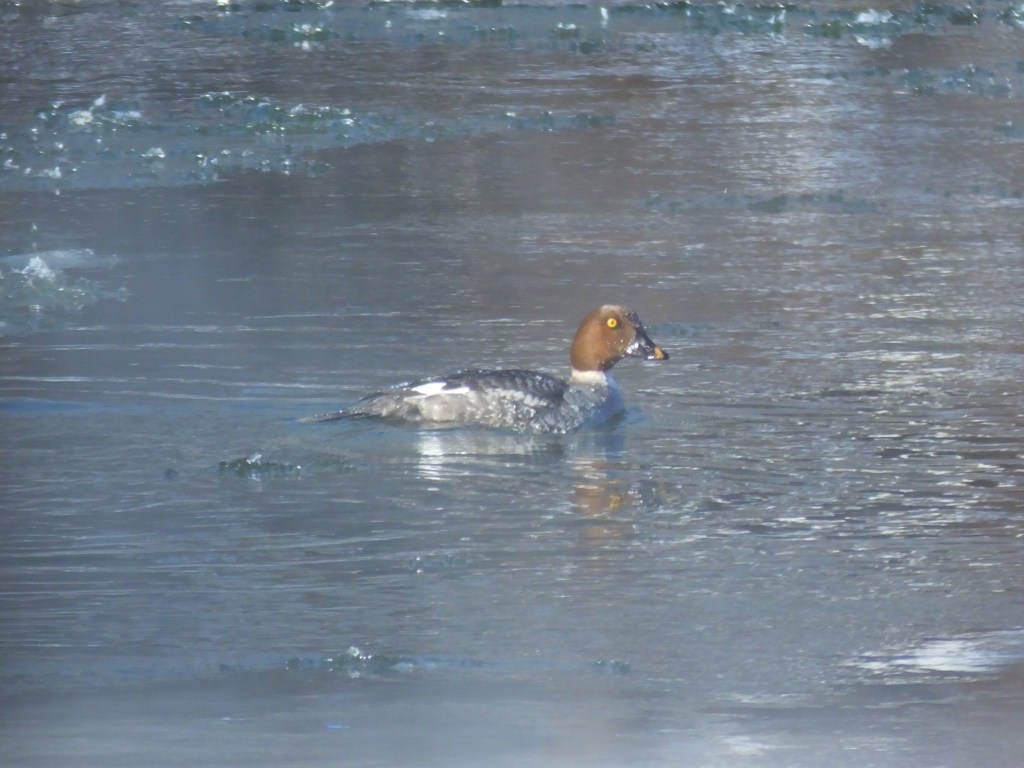 Finally, the goldeneyes were in their usual spot, a bit south of where the river freezes all the way across. They’re very shy, so I stay on the trail a bit up the bluff as I pass them, but they saw me anyway. The male swam downstream first, then appeared to call to the three females, who soon swam down to join him. I could hear the call, and see his outstretched neck, but I never got to see him with his head against his back and beak sticking straight up. Maybe next time.