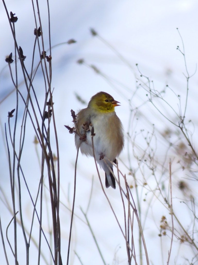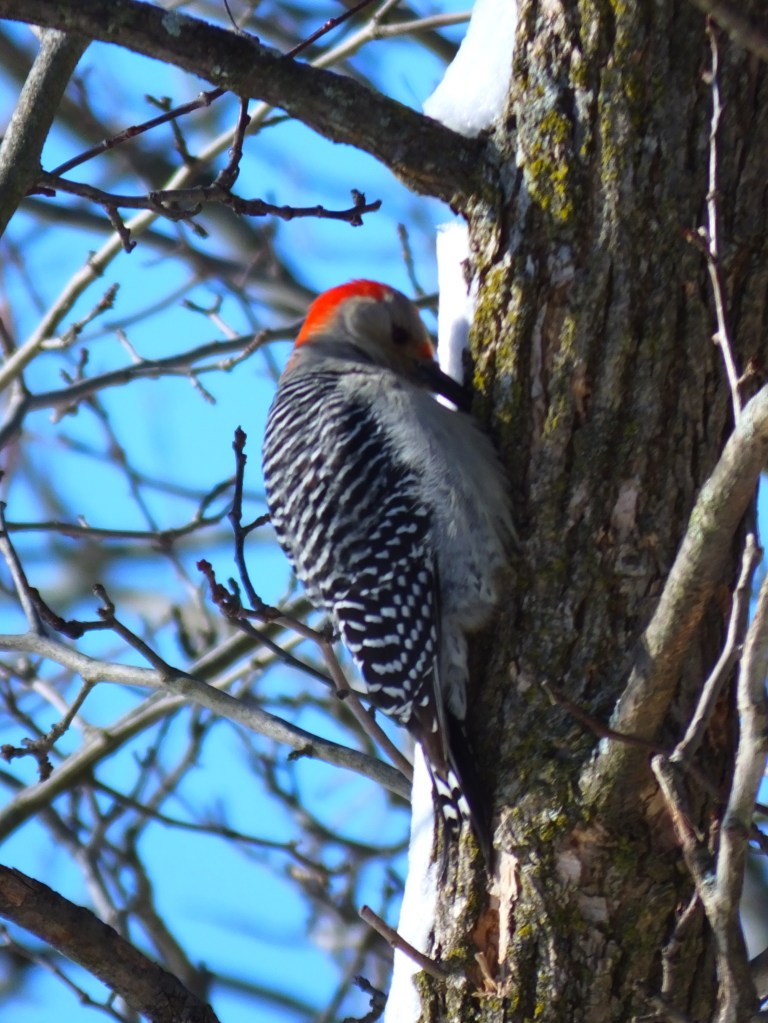 When I got to the pond, it was quiet. Too quiet, I thought, and as I stood there trying to spot even one junco, a Cooper’s hawk flew over my shoulder and into the far trees out of range. It was as though I had flipped a switch. Suddenly the chickadees were chirping, the juncos were hoping, and the cardinals were flitting from branch to branch. Here’s a red-bellied woodpecker back to work on that tree trunk and a goldfinch gulping down a morsel it had just found.