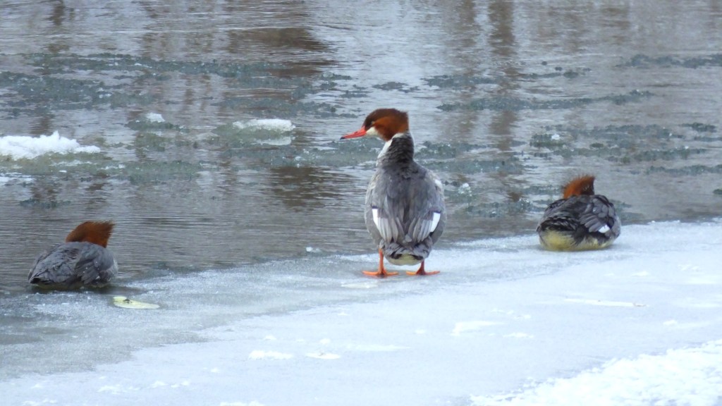The five female common mergansers were in their usual spot on the lower river, and I even got a nice shot of them all lined up, but this close-up of the middle one standing up for a moment to keep and eye on me looked better.