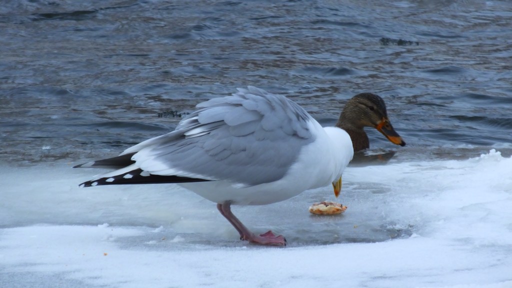 Also on the lower river, a herring gull was working on a morsel it had found while a female mallard looks on.