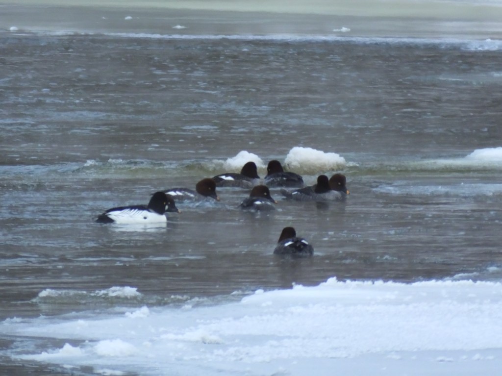 The group of goldeneyes upstream has grown to eight females and one male, but they are just as shy as ever, so I can only get this group shot from far away, and the steam fog is still present.